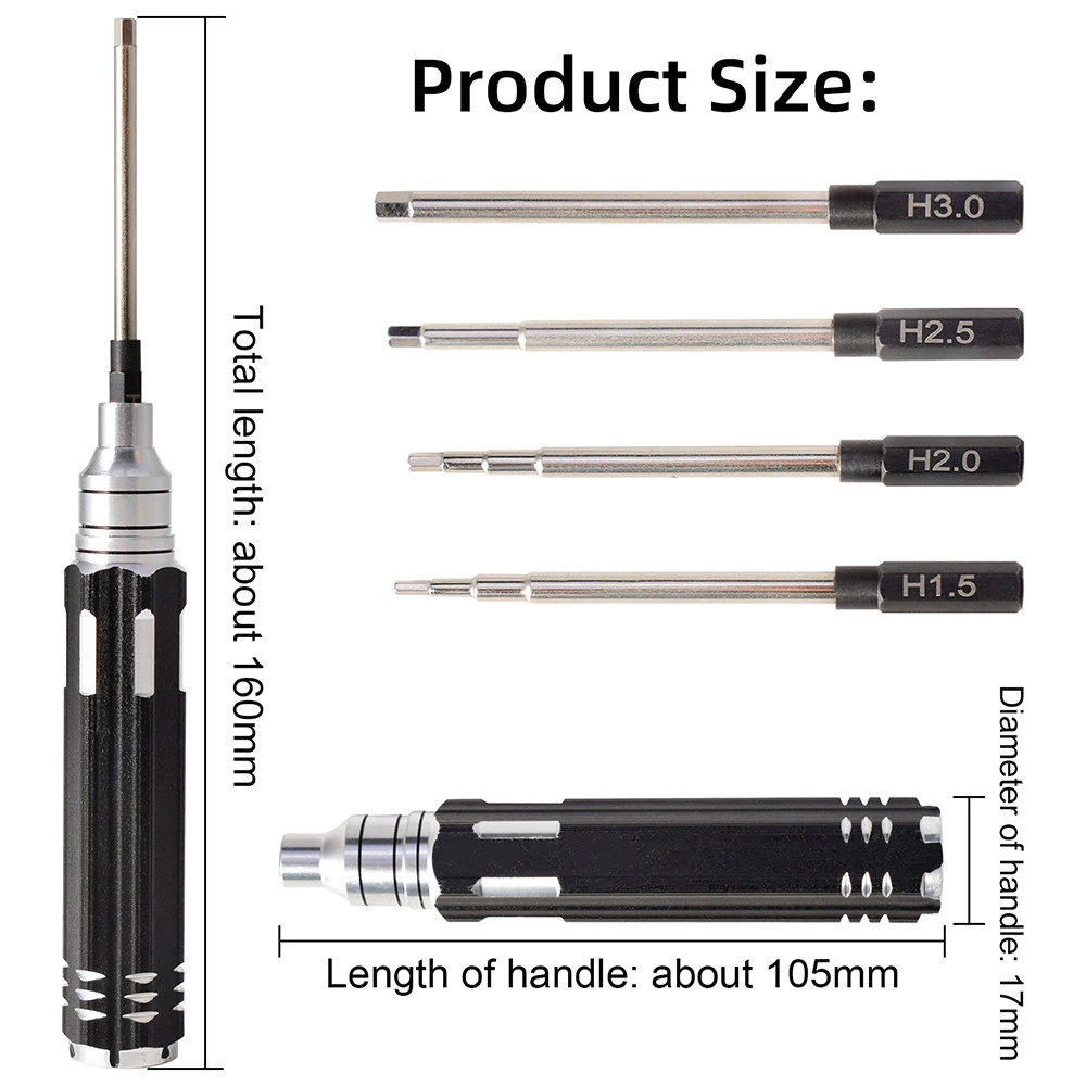 2. Hex Driver Wrench Dimensions: 4pcs hex screwdriver set (hex driver 1.5mm 2.0mm 2.5mm 3.0mm RC tool kit).