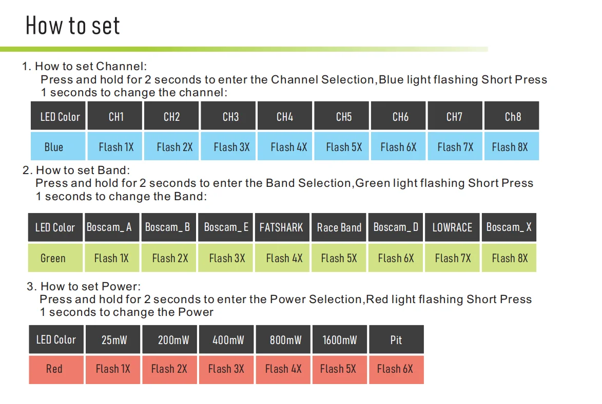 2. Six power levels: 25mW/200mW/400mW/800mW/1600mW/Pit mode .